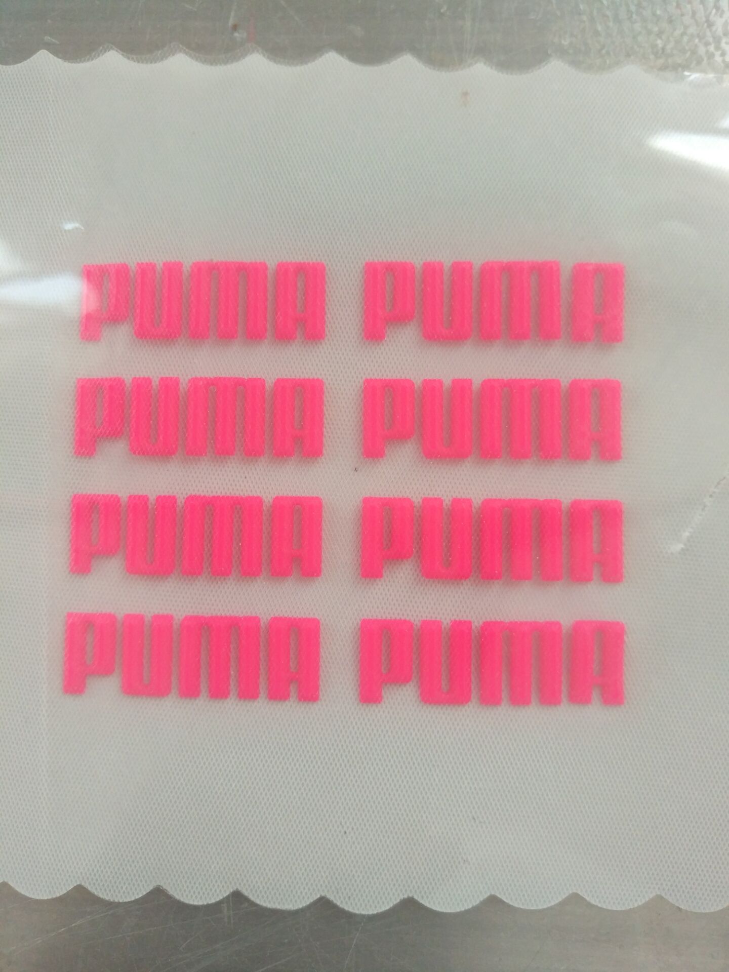 6. 把低粘度热转印模撕起,粘起模具上的固体硅胶,要顺应图案位置撕起,不可移位。这其中的固体硅胶就是硅胶商标了。
